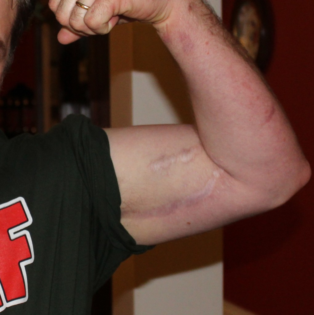 The lower scar, caused by placing an AV Fistula for dialysis access, extends from Mark’s shoulder to just below the inside of his elbow. We were told the incision would be 3″-4″ long and he would return to work in a few days.